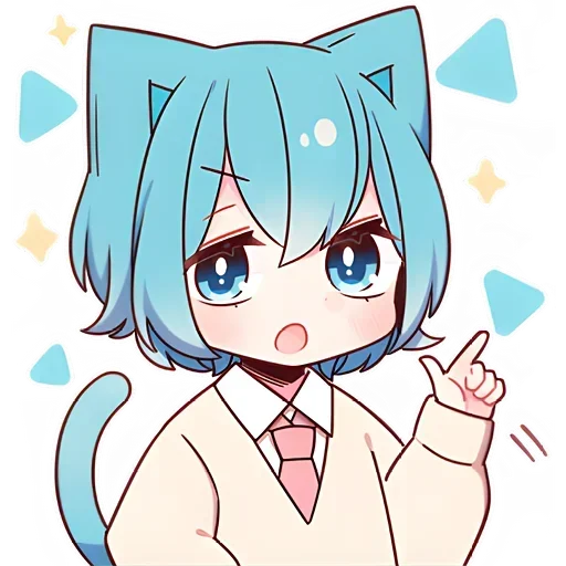 Garota de cabelo azul com orelhas de gato, expressão surpresa, usando suéter branco e gravata rosa, com triangles e estrelas ao redor.