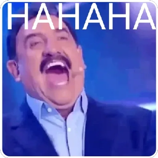 Um homem de terno e camisa azul ri com a boca aberta e lágrimas nos olhos. O texto 'HAHAHA' aparece acima dele.