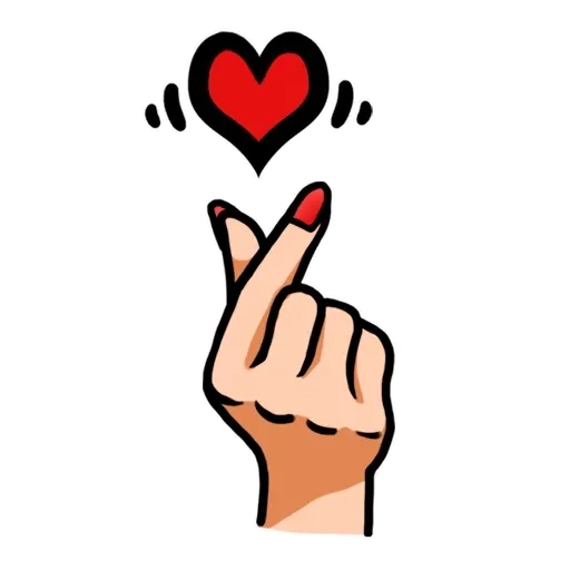 Mão com dedo indicador levantado e unha pintada de vermelho, apontando para um coração vermelho com contorno preto que parece flutuar acima.