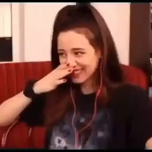 Uma jovem com cabelos castanhos e um sorriso tímido, cobrindo a boca com a mão.