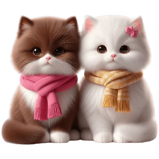 Dois gatinhos fofos, um castanho com cachecol rosa e outro branco com roupa laranja, ambos com expressão doce.