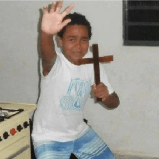 Menino com cruz de madeira acenando com a mão direita, usando uma camiseta branca e calça jeans.