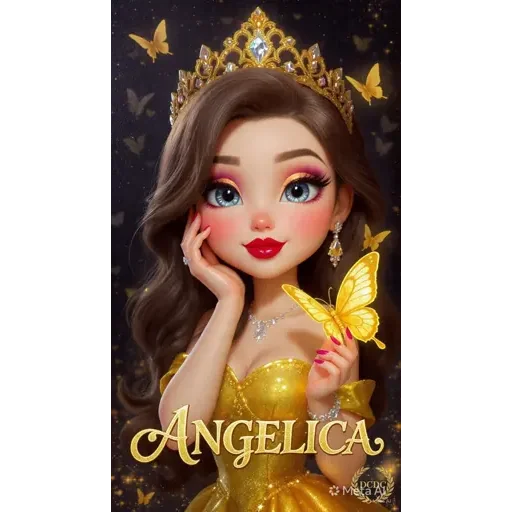 Uma princesa de cabelo castanho e olhos azuis usa uma coroa dourada e um vestido dourado, segurando uma borboleta dourada, com o nome 'ANGELICA' em letras douradas na parte inferior.