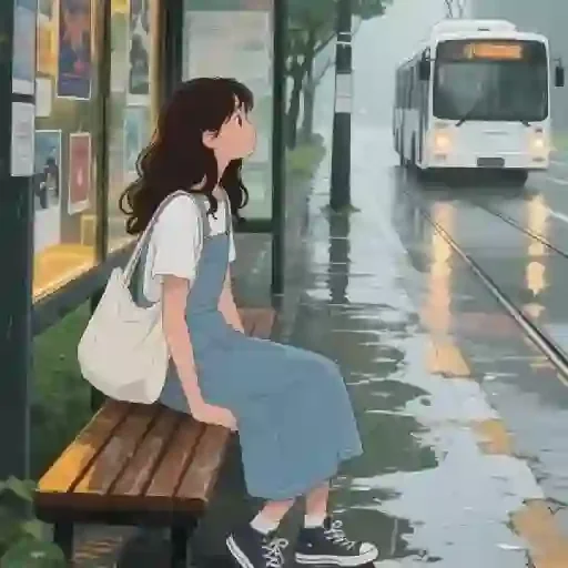 Uma jovem com cabelos castanhos sentada em um banco de madeira em uma parada de ônibus, vestindo um macacão azul e uma mochila branca, enquanto um ônibus branco se aproxima na chuva.