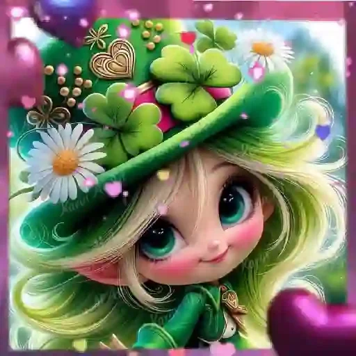 Uma menina fofa com cabelos verdes e chapéu verde decorado com trevos, flores e corações. Ela tem olhos azuis brilhantes e bochechas rosadas.