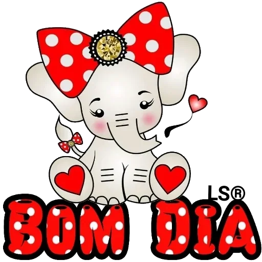 Um elefante branco fofinho com um laço vermelho e branco de bolinhas brancas na cabeça, segurando um coração e com outro coração no pé. Abaixo dele, está escrito 'BOM DIA' em letras grandes e vermelhas.