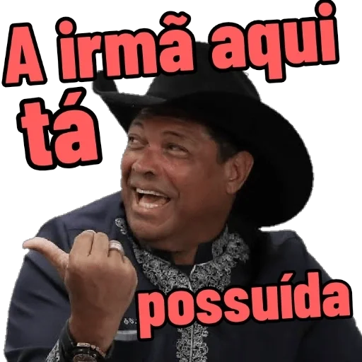 Um homem com um chapéu preto e uma camisa escura com detalhes claros, fazendo um gesto com a mão e com uma expressão facial engraçada. A imagem tem o texto 'A irmã aqui tá possuída' em letras vermelhas.