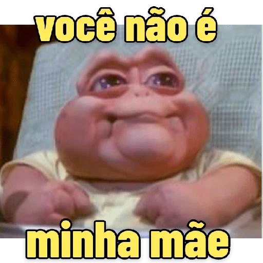 Um personagem de aparência rechonchuda com expressão facial séria e braços cruzados, com o texto "você não é minha mãe" sobreposto em amarelo.