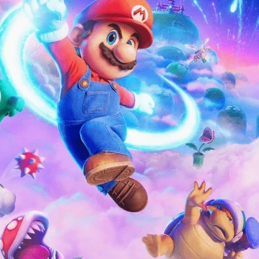 Mario voando com um brilho azul ao redor, usando um macacão azul e um chapéu vermelho com um 'M' branco. Fundo roxo com nuvens e outros personagens.