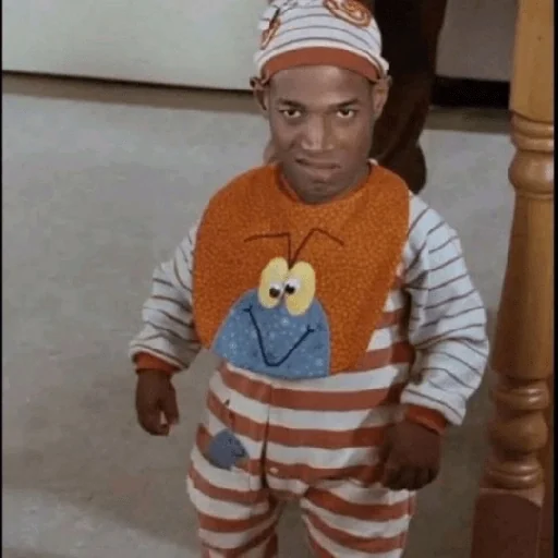 Menino pequeno com expressão séria, vestindo pijama listrado laranja e branco com um desenho de Cookie Monster no peito.