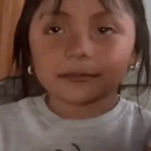 Menina com expressão facial séria, cabelo preto e franja, usando um colar e uma camiseta cinza.