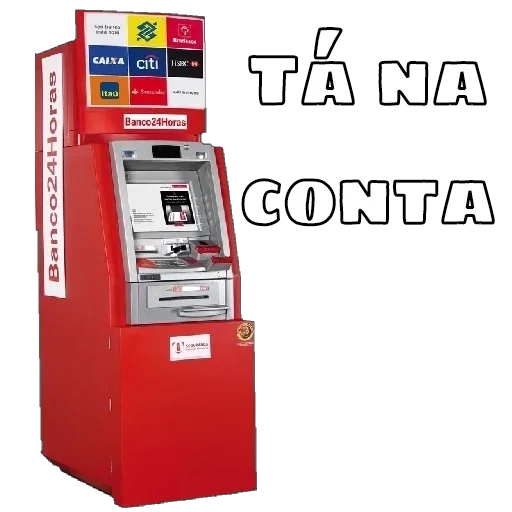 Um caixa eletrônico vermelho com a frase 'TÁ NA CONTA' ao lado.