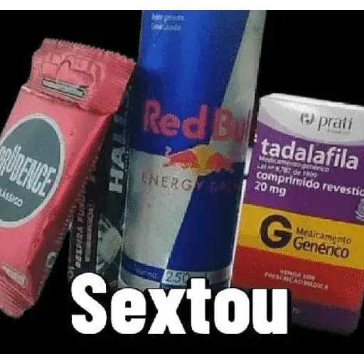 Um conjunto de produtos incluindo um chocolate, uma lata de Red Bull e um medicamento, com o texto 'Sextou' embaixo.