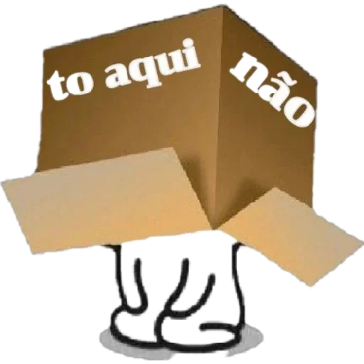 Uma caixa de papelão marrom com as palavras 'to aqui não' escrita em branco, com uma pessoa escondida dentro.