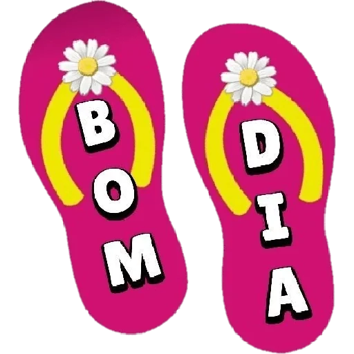 Um par de chinelos de borracha rosa com as letras 'BOM DIA' e flores brancas.