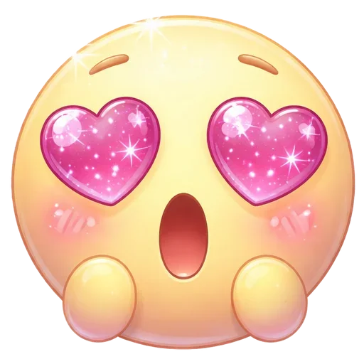 Um emoji amarelo com olhos em forma de coração rosa brilhante e boca aberta, com bochechas rosadas e sobrancelhas inclinadas para baixo.