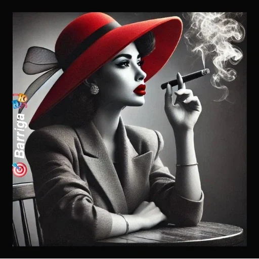 Mulher elegante com chapéu vermelho e cigarro, sentada à mesa com fundo cinza. Ela usa um casaco e tem um laço no chapéu.