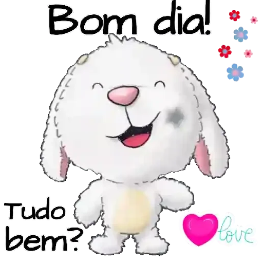 Um coelho branco fofinho com um sorriso grande e olhos fechados, dizendo 'Bom dia!' e 'Tudo bem?' com um coração rosa e flores ao fundo.