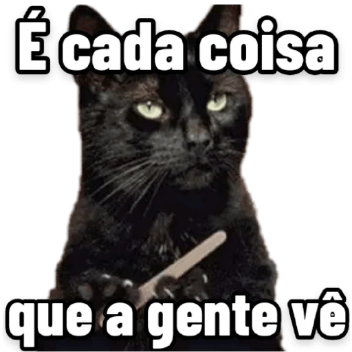 Gato preto com expressão séria e olhar lateral, segurando um objeto, com texto "É cada coisa que a gente vê" sobreposto.