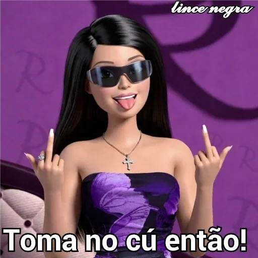 Uma mulher de cabelo preto e óculos de sol fazendo um gesto obsceno com as mãos, vestindo um top roxo. Abaixo dela, está escrito 'Toma no cú então!'