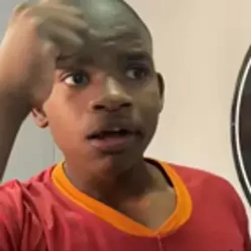 Menino com expressão de surpresa ou preocupação, mão na cabeça, vestindo uma camisa vermelha com gola laranja.