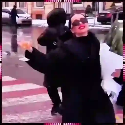 Mulher loira com óculos de sol e batom vermelho, vestida de preto, fazendo um gesto com a mão em um cruzamento de pedestres molhado, com outras pessoas ao fundo.