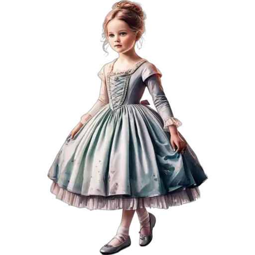 Uma menina com vestido azul e rosa, cabelo castanho claro preso, sapatos brancos e meias.