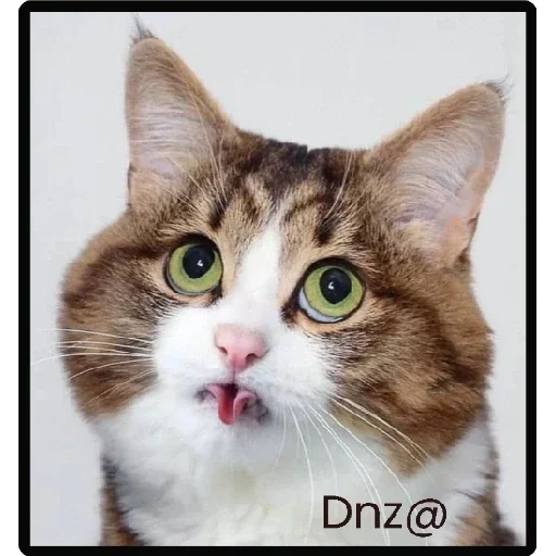 Gato com olhos verdes e focinho branco, língua rosa para fora, fundo branco. 'Dnz@' no canto inferior direito.