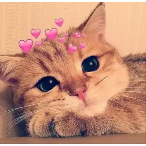 Gato com corações rosa sobre a cabeça, parecendo sonolento ou sonhando. O gato tem olhos grandes e pelagem laranja com manchas.