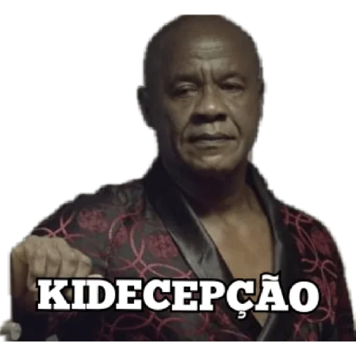 Um homem negro careca com uma expressão séria, vestindo uma camisa vermelha e preta, com o texto 'KIDECEPÇÃO' sobreposto.