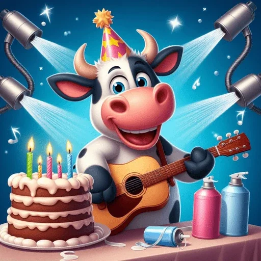 Vaca usando um chapéu de festa, tocando guitarra e com um bolo de aniversário com velas ao lado, em um palco com holofotes.