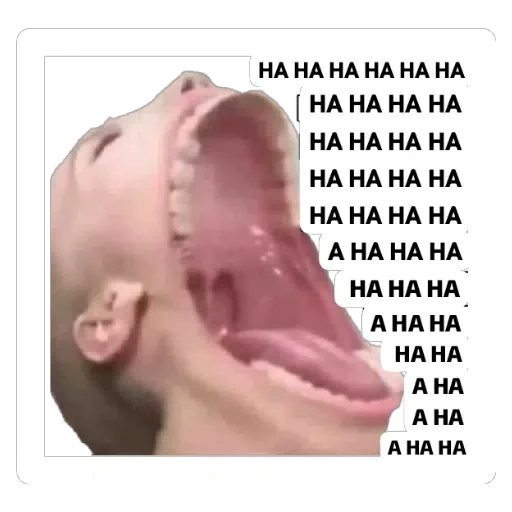 Um homem ri alto com a boca aberta e os olhos fechados. Ele tem um fundo vermelho e azul. 'HA HA HA HA' está escrito em…