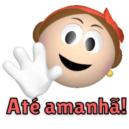 Uma figurinha de uma personagem com um sorriso largo e um aceno de mão, usando um chapéu vermelho e com a frase 'Até amanhã!' embaixo.