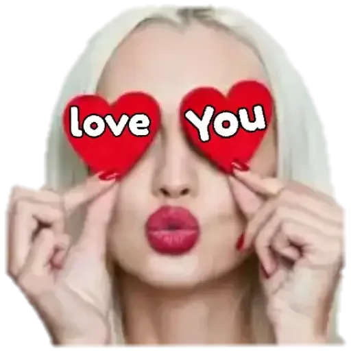 Mulher com coração vermelho nos olhos e texto 'love You'. Ela tem cabelo loiro, lábios vermelhos e unhas pintadas de vermelho.
