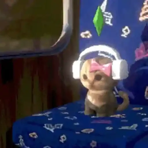 Um gato com óculos de sol rosa e fones de ouvido brancos sentado em uma cama com lençol azul decorado, em um ambiente com parede azul e objetos flutuantes.
