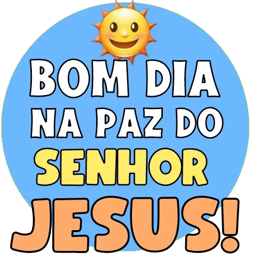 Um sol sorridente em um círculo azul com a frase 'BOM DIA NA PAZ DO SENHOR JESUS!' em letras grandes e coloridas.