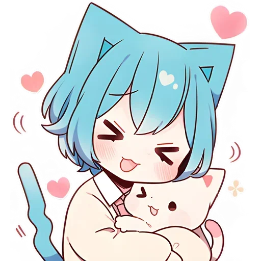 Uma menina com cabelo azul e orelhas de gato abraçando um gato branco, rodeada de corações rosa e azuis.