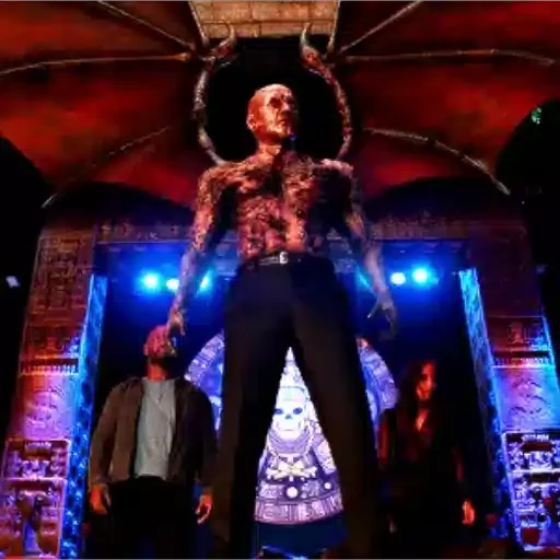 Um homem musculoso e tatuado, sem camisa e com calças pretas, está em pé em frente a um fundo colorido com luzes azuis e uma porta decorada. Ele parece estar em um ambiente noturno.