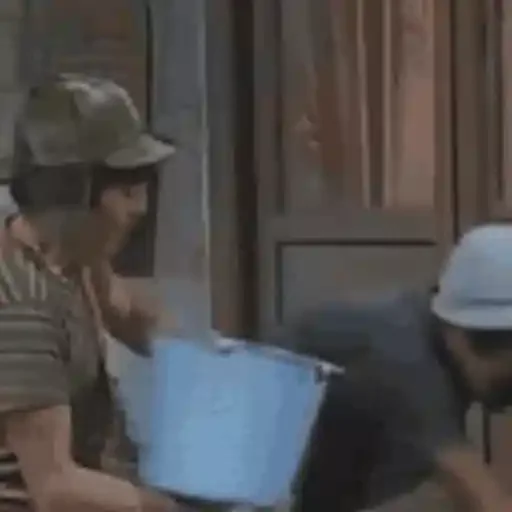 Dois homens, um de chapéu castanho e outro de chapéu azul, olhando para um papel em uma mão, em frente a uma porta marrom.