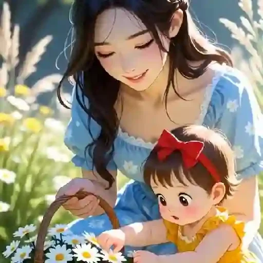 Uma mulher e uma menina estão em um campo de flores. A mulher tem cabelo preto e veste um vestido azul, enquanto a menina tem um laço vermelho no cabelo e um vestido amarelo.