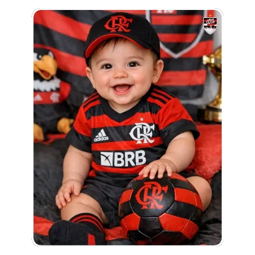 Um bebê sorrindo e usando uma camisa e um boné do Flamengo, segurando uma bola de futebol com o logo do time. O bebê está sentado em um sofá com um ursinho ao lado.