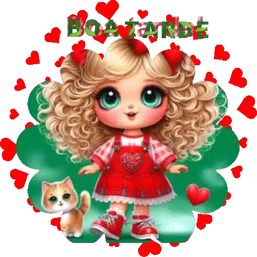 Uma menina loira com olhos azuis e um vestido vermelho, acompanhada de um gato laranja, rodeada de corações vermelhos e a frase 'BOA TARDE' em verde.