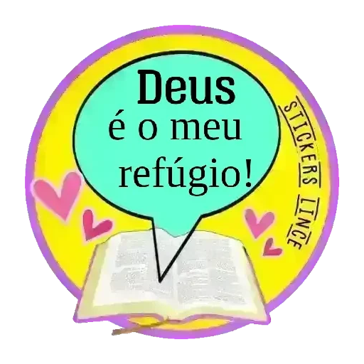 Uma figurinha com um círculo amarelo e um livro aberto na parte inferior. No centro, uma bolha de fala verde com o texto 'Deus é o meu refúgio!' e corações rosa ao redor.