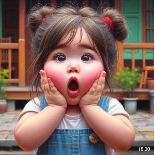 Menina com expressão de surpresa, mãos no rosto corado, olhando com olhos arregalados e boca aberta.