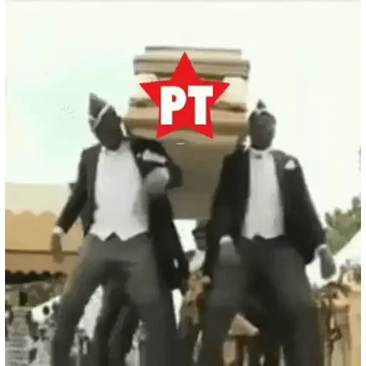 Dois homens dançando em frente a um monumento, vestidos com terno preto e camisa branca, com uma estrela vermelha e 'PT' sobreposto.