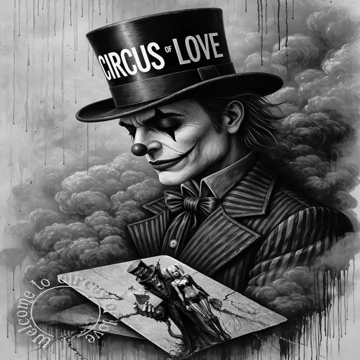 Um homem com maquiagem de palhaço, usando um chapéu de circo com as palavras 'CIRCUS LOVE', segura um quadro com uma imagem em preto e branco. Ele está vestido com um terno listrado e tem uma expressão sorridente.