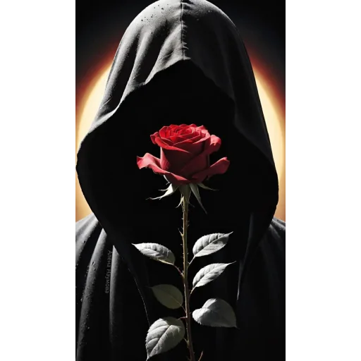Uma pessoa vestida com capuz segurando uma rosa vermelha na frente do rosto, com um fundo escuro e uma auréola de luz.