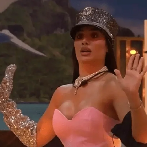 Mulher com vestido rosa, luvas brilhantes, colar e chapéu, fazendo gesto com a mão em frente a um cenário noturno.