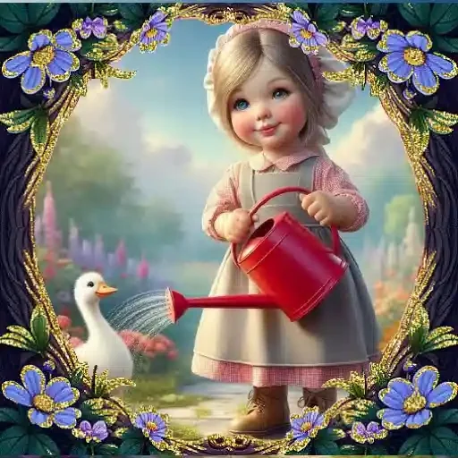Menina com vestido cinza e flores no cabelo regando um passarinho com um regador, cercada por flores roxas e azuis.
