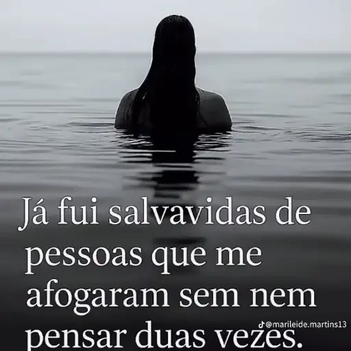Uma mulher de costas está na água, com a frase 'Já fui salvavidas de pessoas que me afogaram sem nem pensar duas vezes.'